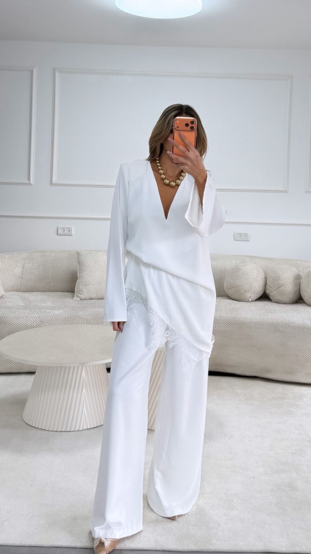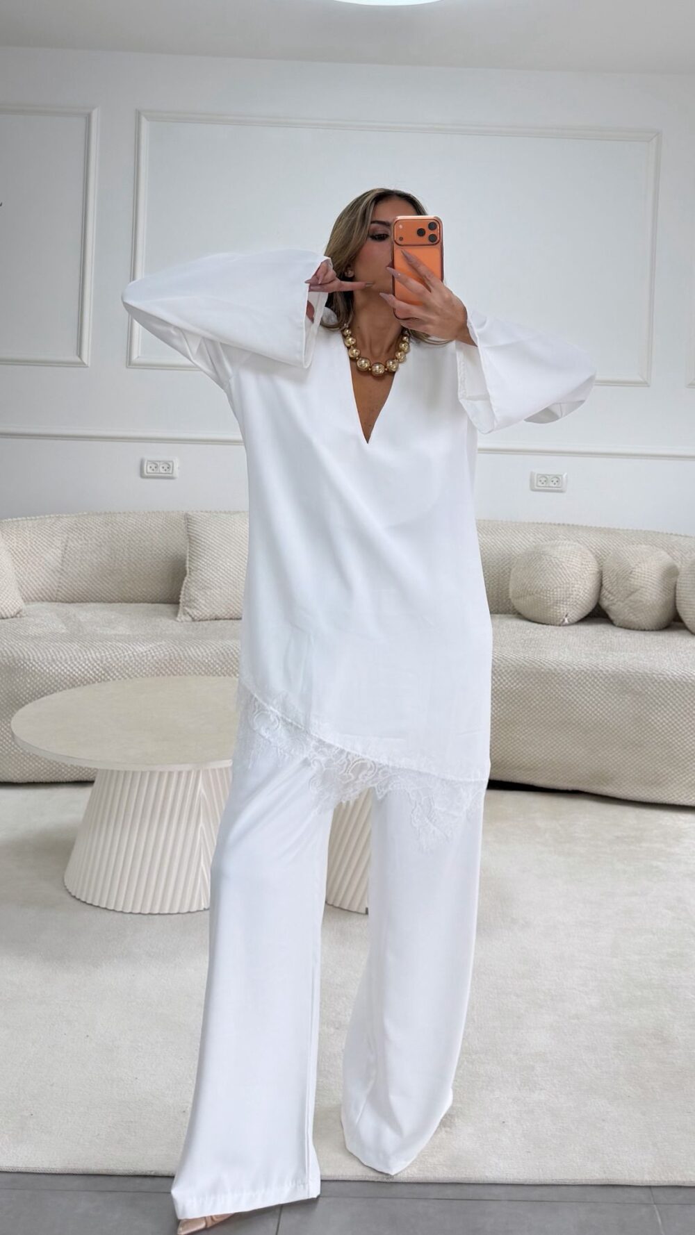 חליפת מכנס אלגנטית חולצת טוניקה עם גימור פס תחרה .