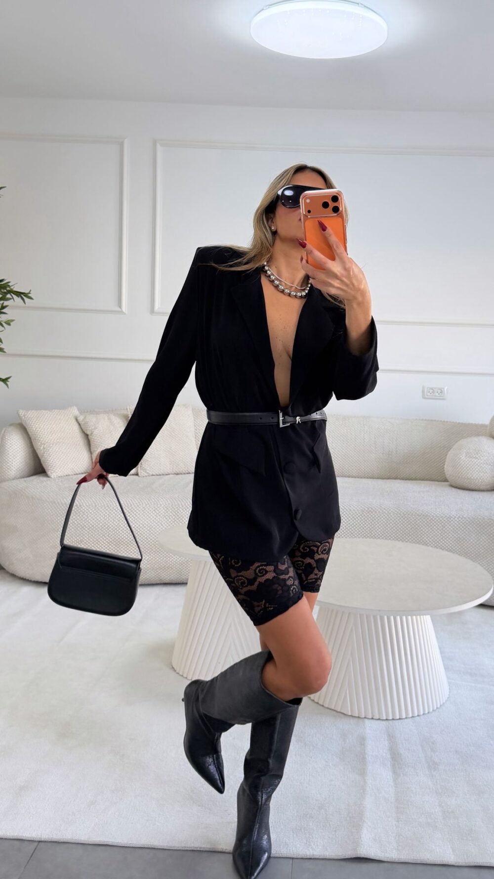 חליפת גקט אוברסייז מחויט ומכנס תחרה צמוד באורך ברך