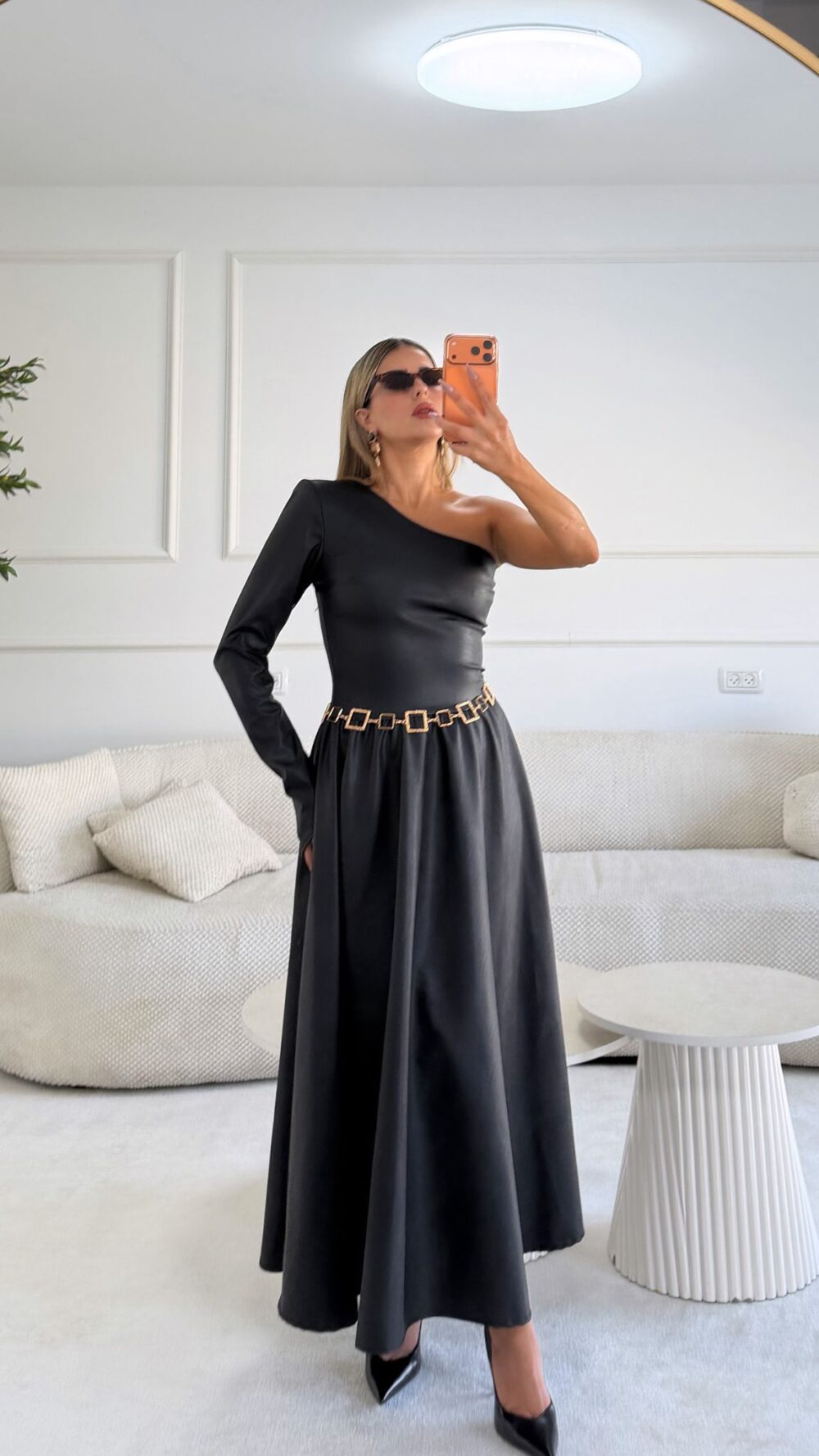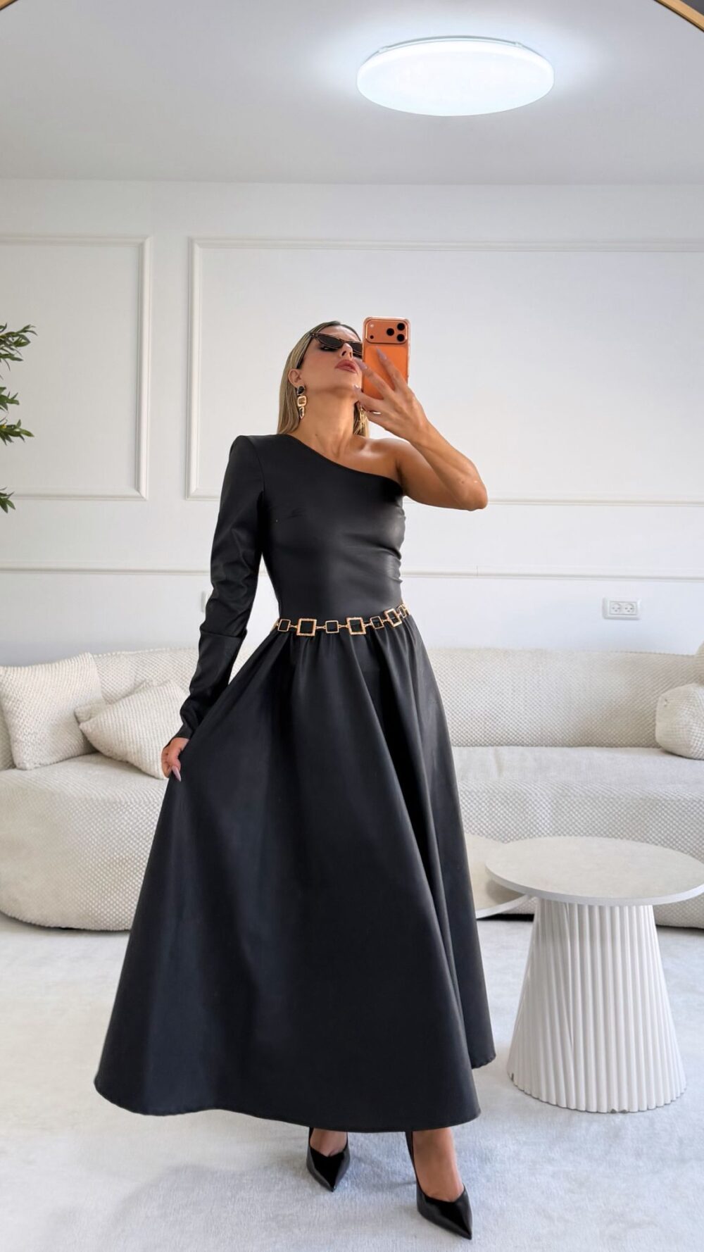 שמלת מידי שרוול אחד מבד דמוי עור איכותי