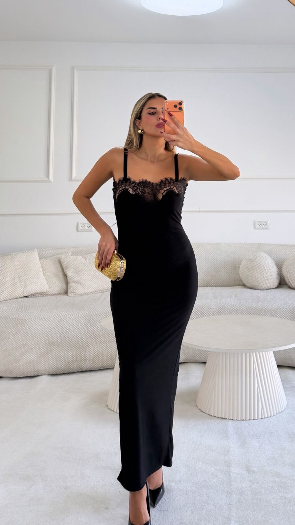 שמלת מידי כתפיות מעוטרת בד תחרה במפתח חזה